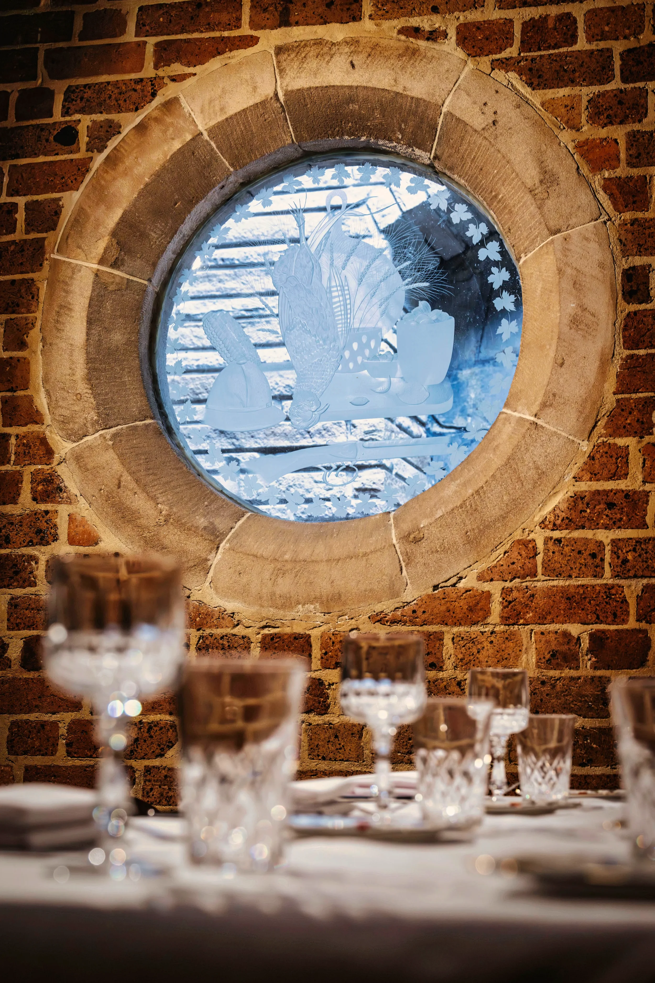 On one wall, a round window etched with pheasant feathers, a hunter’s rifle and a bowler hat. On the other, a gothic arch alive with a school of swirling fish.